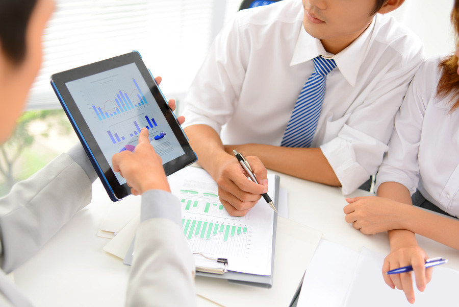 Close-up of business partners discussing financial document in touchpad